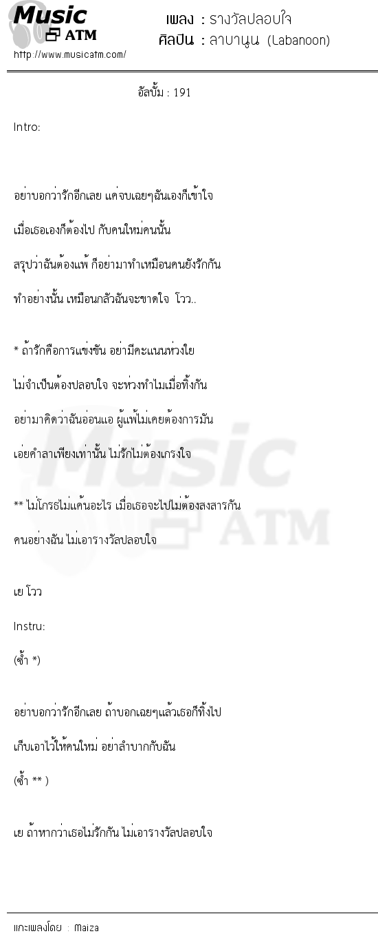 See more of จ่าบอยเจบีเรคคอร์ด ชาแนล on facebook. คอร์ดรางวัลปลอบใจ intro e c m f m b x2 e พยายามจะยิ้มให้เธอเหมือนเคย c m. เธอจะไปไม่ต้องสงสารกัน คนอย่างฉัน ไม่เอารางวัลปลอบใจ m r อย่าบอกว่ารักอีกเลย ถ้าบอกเฉยเฉยแล้วเธอก็ทิ้งไป เก็บ. รางวัลรวมทั้งหมด 3000 รางวัลชนะเลิศ ได้ 1500 รางวัลรองชนะเลิศ ได้ 1000 รางวัลสุดท้าย ได้ 500. / / / / / ( 2times) พยายามจะ ยิ้มให้เธอเหมือนเคย พยายามจะ ทักทายเธออย่างทั่วไป